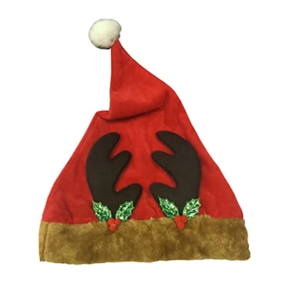Santa Hat Embossed reindeer antlers and mistletoe Brown fur effect hat bottom and white pompom Perfect accessory to play as Santa at the holiday season, Manufacturer: Rubie's