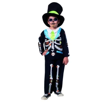 Catrin and Catrinas, one of the girls' favourite costumes to celebrate the day of the dead. At Rubies you can find the Halloween costume collection for boys and girls, with which you can celebrate Halloween or Day of the Dead with the costumes of the most colourful characters from the Day of the Dead INCLUDES - The catrin costume for kids includes a jacket with printed details of Mexican skulls and attached shirt, matching trousers and a black top hat. Velcro back closure for easy wearing This costume is made of polyester, a comfortable and durable material for long hours of play, theme parties, children's parties and Halloween parties. Sizes: Available for boys and girls from 3 years. Size XXS for 3 to 4 years, Size XS from 5 to 6 years and Size S for 7 to 8 years. Please see the size chart in the pictures. For the safety of children, all our costumes are manufactured and approved according to European toy safety regulations. Occasions: boy halloween costume, halloween costume for girl, halloween costume for kids, Halloween, Witches Night, Night of the Dead, Carnival, Cosplay, Theme Party, School Dance, School Function, Photo Shoot, Shows, Manufacturer: Rubies
