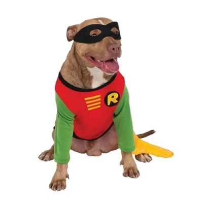 Teen Titans Robin pet costume features red shirt with green sleeves, detachable cape and eye mask Size Extra-Large fits 24-inch chest and 28-inch neck to tail Suggested for Springer Spaniel, Brittany Spaniel, Collie, Bulldog, Schnauzer and similar size animals Rubie's Official Licensed Product - Dress Up for the Whole Family US designed and sized product, please refer to sizing chart image for reference Ideal Dress Up for Themed Parties, Halloween and World Book Day