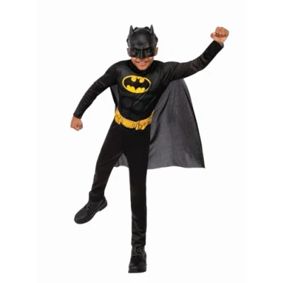 Batman costume: Transform your child into a Batman superhero with this officially licensed costume AVAILABLE IN VARIOUS SIZES: This costume is designed to fit most children, providing a comfortable fit. AUTHENTIC DESIGN: This official costume is true to the look of the Batman superhero, with its long cape, iconic black and yellow colours and the famous bat print logo. VELCRO ATTACHES: The costume has velcro fasteners on the back and on the cape for a secure fit and ease of use. PERFECT FOR PARTIES - This official DC Batman costume is ideal for Halloween costume parties, superhero themed birthdays and carnival parades., Manufacturer: RUBIES