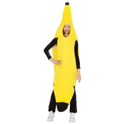 A fun full banana jumpsuit; discover the wide variety of scream costumes and create an optimal Macedonia for group going to themed parties, carnival or farewell INCLUDES: This adult banana costume contains banana shaped tunic in yellow color with details; pull on closure for easy donning This costume is made of polyester a comfortable and durable material for any party or event For adults, men and women ages 18 and up; recommend checking the size guide in images; one size, or standard size Occasions: girls costume for celebrating Halloween, Christmas, Carnival, Easter, Prom, Book Day, Children's Day, Cosplay, Party, Festivals, Holiday, Pageant, Wedding, Birthday, School Prom, Photo Shoot, Stage Performance, Ceremony and other occasions, Manufacturer: Rubies