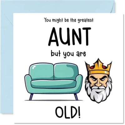 MAKE YOUR AUNT LAUGH OUT LOUD WITH THIS HILARIOUS BIRTHDAY CARD: This exceptional quality Aunt birthday card shows the design 'You Might Be The Greatest Aunt But You Are Sofa King Old!'. If you are looking for a funny birthday card Aunt, then this happy birthday Aunt card is bound to make them giggle. Not just a birthday card for Aunt this could also be a birthday gifts for Aunt, Aunty or Auntie. WHAT DO YOU GET: The cards are printed on both sides with the inside print saying 'Happy Birthday To You' and ample space for your own personal message. The funny design is printed on a specially sourced and environmentally responsible board. At 360 microns thick the natural white one-sided gloss board has a quality look and feel. Supplied with a coloured gummed envelope to complement the design and ready to be sealed and sent in the post. NO INK SMUDGES: There is nothing worse than writing inside a card to find that the shiny surface makes the ink smudge. This is why we use a high quality one sided coated board. The uncoated side will absorb more of the ink from your pen to make smudging a thing of the past. funny Aunt birthday cards, rude Aunt birthday cards from Nephew. SIZES: Greeting Card = 145mm x 145mm, Envelope = 155mm x 155mm, Card Thickness = 360 micron. Happy birthday Aunt, Aunts birthday card, Aunt cards birthday, birthday card Aunt, banter birthday Aunt card, Aunt gifts from Nephew, joke birthday card for Aunt. MADE AND QUALITY CHECKED IN THE UK: We print and manufacture all our products right here in the UK so you can be sure of a fast turnaround and a product that is expertly made. Using environmentally responsible premium board our card is conscious of the responsible management of the world's forests - happy birthday card Aunt offensive, Aunt birthday card hilarious.