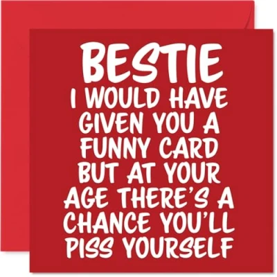MAKE YOUR BESTIE LAUGH OUT LOUD WITH THIS HILARIOUS BIRTHDAY CARD: This exceptional quality Bestie birthday card shows the design 'Bestie I would have given you a funny card but at your age theres a chance youll piss yourself'. If you are looking for a funny birthday card Bestie, then this happy birthday Bestie card is bound to make them giggle. Not just a birthday card for Bestie this could also be a birthday gifts for Bestie, Friend or Best Friend. WHAT DO YOU GET: The card is printed on one side and BLANK ON THE INSIDE to allow you to write your very own message. The unique fun design is printed on a specially sourced and environmentally responsible board. At 360 microns thick the natural white one-sided gloss board has a quality look and feel. Supplied with a coloured gummed envelope to complement the design and ready to be sealed and sent in the post. Best Friend birthday card, Friend birthday card. NO INK SMUDGES: There is nothing worse than writing inside a card to find that the shiny surface makes the ink smudge. This is why we use a high quality one sided coated board. The uncoated side will absorb more of the ink from your pen to make smudging a thing of the past. funny Bestie birthday cards, rude Bestie birthday cards from Best Friend. SIZES: Greeting Card = 145mm x 145mm, Envelope = 155mm x 155mm, Card Thickness = 360 micron. Happy birthday Bestie, Besties birthday card, Bestie cards birthday, birthday card Bestie, banter birthday Bestie card, Bestie gifts from Best Friend, joke birthday card for Bestie. MADE AND QUALITY CHECKED IN THE UK: We print and manufacture all our products right here in the UK so you can be sure of a fast turnaround and a product that is expertly made. Using environmentally responsible premium board our card is conscious of the responsible management of the world's forests - happy birthday card Bestie offensive, Bestie birthday card hilarious.