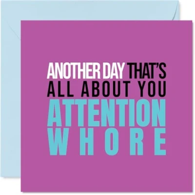 MAKE HER SMILE WITH THIS UNIQUE BIRTHDAY CARD: This exceptional quality Female birthday card for her shows the design 'Another Day That?s All About You Attention Whore'. If you are looking for a beautiful birthday card Girls for her, then then this happy birthday card is bound to make her smile. Not just a birthday card for Women this could also be a birthday gifts for Cousin, Nan, Friend, Auntie, Grandma, Neighbour, Colleague or Sister. WHAT DO YOU GET: The card is printed on one side and BLANK ON THE INSIDE to allow you to write your very own message. The unique fun design is printed on a specially sourced and environmentally responsible board. At 360 microns thick the natural white one-sided gloss board has a quality look and feel. Supplied with a coloured gummed envelope to complement the design and ready to be sealed and sent in the post. Great Cousin birthday cards, Girls birthday card, Nan birthday card. NO INK SMUDGES: There is nothing worse than writing inside a card to find that the shiny surface makes the ink smudge. This is why we use a high quality one sided coated board. The uncoated side will absorb more of the ink from your pen to make smudging a thing of the past. Birthday cards for Friend, Birthday card for Auntie, Birthday cards for Grandma. SIZES: Greeting Card = 145mm x 145mm, Envelope = 155mm x 155mm, Card Thickness = 360 micron. Neighbour birthday card, birthday cards for Colleague, unique birthday cards for Sister, Girls birthday card Cousin, Nan birthday card. MADE AND QUALITY CHECKED IN THE UK: We print and manufacture all our products right here in the UK so you can be sure of a fast turnaround and a product that is expertly made. Using environmentally responsible premium board our card is conscious of the responsible management of the world's forests - perfect birthday cards for Women, fun birthday cards for her, Nan birthday cards, female birthday cards.