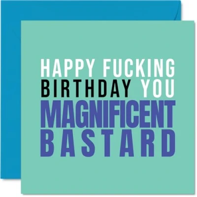 MAKE THEM LAUGH WITH THIS HILARIOUS BIRTHDAY CARD: This exceptional quality Bday birthday card for him or her shows the design 'Happy Fucking Birthday You Magnificent Bastard'. If you are looking for a cheeky birthday card Women for her or him, then then this happy birthday card is bound to make them smile. Not just a birthday card for Men this could also be a birthday gifts for Grandma, Cousin, Brother, Nanny, Nan, Colleague, Dad or Neighbour. WHAT DO YOU GET: The card is printed on one side and BLANK ON THE INSIDE to allow you to write your very own message. The unique fun design is printed on a specially sourced and environmentally responsible board. At 360 microns thick the natural white one-sided gloss board has a quality look and feel. Supplied with a coloured gummed envelope to complement the design and ready to be sealed and sent in the post. Funny Grandma birthday cards, Women birthday card, Cousin birthday card. NO INK SMUDGES: There is nothing worse than writing inside a card to find that the shiny surface makes the ink smudge. This is why we use a high quality one sided coated board. The uncoated side will absorb more of the ink from your pen to make smudging a thing of the past. Birthday cards for Brother, Birthday card for Nanny, Birthday cards for Nan. SIZES: Greeting Card = 145mm x 145mm, Envelope = 155mm x 155mm, Card Thickness = 360 micron. Colleague birthday card, birthday cards for Dad, rude birthday cards for Neighbour, Men birthday card, Cousin birthday card. MADE AND QUALITY CHECKED IN THE UK: We print and manufacture all our products right here in the UK so you can be sure of a fast turnaround and a product that is expertly made. Using environmentally responsible premium board our card is conscious of the responsible management of the world's forests - perfect birthday cards for Men, banter birthday cards for her, Cousin birthday cards, unisex birthday cards.
