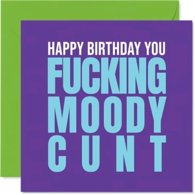 MAKE THEM SMILE WITH THIS UNIQUE BIRTHDAY CARD: This exceptional quality Bday birthday card for him or her shows the design 'Happy Birthday You Moody Cunt'. If you are looking for a unique birthday card Women for her or him, then then this happy birthday card is bound to make them smile. Not just a birthday card for Men this could also be a birthday gifts for Grandma, Cousin, Brother, Nanny, Nan, Colleague, Dad or Neighbour. WHAT DO YOU GET: The card is printed on one side and BLANK ON THE INSIDE to allow you to write your very own message. The unique fun design is printed on a specially sourced and environmentally responsible board. At 360 microns thick the natural white one-sided gloss board has a quality look and feel. Supplied with a coloured gummed envelope to complement the design and ready to be sealed and sent in the post. Great Grandma birthday cards, Women birthday card, Cousin birthday card. NO INK SMUDGES: There is nothing worse than writing inside a card to find that the shiny surface makes the ink smudge. This is why we use a high quality one sided coated board. The uncoated side will absorb more of the ink from your pen to make smudging a thing of the past. Birthday cards for Brother, Birthday card for Nanny, Birthday cards for Nan. SIZES: Greeting Card = 145mm x 145mm, Envelope = 155mm x 155mm, Card Thickness = 360 micron. Colleague birthday card, birthday cards for Dad, unique birthday cards for Neighbour, Men birthday card, Cousin birthday card. MADE AND QUALITY CHECKED IN THE UK: We print and manufacture all our products right here in the UK so you can be sure of a fast turnaround and a product that is expertly made. Using environmentally responsible premium board our card is conscious of the responsible management of the world's forests - perfect birthday cards for Men, fun birthday cards for her, Cousin birthday cards, unisex birthday cards.