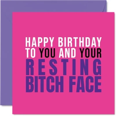 MAKE HER SMILE WITH THIS @@@FjAc9lHjIWb5jFaw5pD1ZcIf9gYUEMES@@@ BIRTHDAY CARD: This exceptional quality Female birthday card for her shows the design 'Happy Birthday To You And Your Resting Bitch Face'. If you are looking for a beautiful birthday card Girls for her, then then this happy birthday card is bound to make her smile. Not just a birthday card for Women this could also be a birthday gifts for Cousin, Nan, Friend, Auntie, Grandma, Neighbour, Colleague or Sister. WHAT DO YOU GET: The card is printed on one side and BLANK ON THE INSIDE to allow you to write your very own message. The unique fun design is printed on a specially sourced and environmentally responsible board. At 360 microns thick the natural white one-sided gloss board has a quality look and feel. Supplied with a coloured gummed envelope to complement the design and ready to be sealed and sent in the post. Great Cousin birthday cards, Girls birthday card, Nan birthday card. NO INK SMUDGES: There is nothing worse than writing inside a card to find that the shiny surface makes the ink smudge. This is why we use a high quality one sided coated board. The uncoated side will absorb more of the ink from your pen to make smudging a thing of the past. Birthday cards for Friend, Birthday card for Auntie, Birthday cards for Grandma. SIZES: Greeting Card = 145mm x 145mm, Envelope = 155mm x 155mm, Card Thickness = 360 micron. Neighbour birthday card, birthday cards for Colleague, unique birthday cards for Sister, Girls birthday card Cousin, Nan birthday card. MADE AND QUALITY CHECKED IN THE UK: We print and manufacture all our products right here in the UK so you can be sure of a fast turnaround and a product that is expertly made. Using environmentally responsible premium board our card is conscious of the responsible management of the world's forests - perfect birthday cards for Women, fun birthday cards for her, Nan birthday cards, female birthday cards.