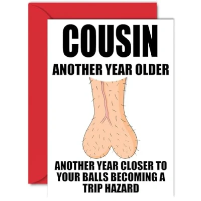 MAKE YOUR COUSIN SMILE WITH THIS HILARIOUS HAPPY BIRTHDAY CARD COUSIN: This exceptional quality birthday card for him or her shows the design "Another year older, another year closer to your balls becoming a trip hazard". If you are looking for beautiful birthday greetings cards for him or her, then this funny happy birthday card is bound to make them smile. Not just for birthday gifts for cousin this could also be a birthday card for your family relative. WHAT DO YOU GET: The card is printed on one side and BLANK ON THE INSIDE to allow you to write your very own message. The unique fun design is printed on a specially sourced and environmentally responsible board. At 360 microns thick the natural white one-sided gloss board has a quality look and feel. Supplied with a coloured gummed envelope to complement the design and ready to be sealed and sent in the post. NO INK SMUDGES: There is nothing worse than writing inside a card to find that the shiny surface makes the ink smudge. This is why we use a high quality one sided coated board. The uncoated side will absorb more of the ink from your pen to make smudging a thing of the past. Happy birthday Cousin cards, Cousin birthday card, Step Cousin birthday cards, 20th birthday card for him, 20th birthday cards for women. SIZES: Greeting Card = 148mm x 210mm, Envelope = 150mm x 212mm, Card Thickness = 360 micron. Great Cousin birthday cards from Cousin. Cousin birthday cards from family, birthday card Cousin , Cousin birthday card, special Cousin birthday cards. MADE AND QUALITY CHECKED IN THE UK: We print and manufacture all our product right her in the UK so you can be sure of a fast turnaround and a product that is expertly made. Using environmentally responsible premium board our card is conscious of the responsible management of the world's forests - birthday cards Cousin, Cousins birthday card.