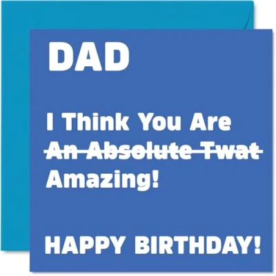 MAKE DAD LAUGH WITH THIS HILARIOUS HAPPY BIRTHDAY CARD DAD: This exceptional quality fathers day card for him shows a funny rude message "An Absolute Twat" being crossed out and replaced with "Amazing!". If you are looking for beautiful birthday greetings cards for him, then this happy fathers day card is bound to make them laugh. Not just for fathers day gifts for Dad this could also be a birthday card for Dad, Daddy, Papa or Father. WHAT DO YOU GET: The card is printed on one side and BLANK ON THE INSIDE to allow you to write your very own message. The unique fun design is printed on a specially sourced and environmentally responsible board. At 360 microns thick the natural white one-sided gloss board has a quality look and feel. Supplied with a coloured gummed envelope to complement the design and ready to be sealed and sent in the post. NO INK SMUDGES: There is nothing worse than writing inside a card to find that the shiny surface makes the ink smudge. This is why we use a high quality one sided coated board. The uncoated side will absorb more of the ink from your pen to make smudging a thing of the past. Happy birthday Dad cards, Dad birthday card, Daddy birthday cards. SIZES: Greeting Card = 145mm x 145mm, Envelope = 155mm x 155mm, Card Thickness = 360 micron. Great Dad fathers day cards from Daughter or Son. Dad birthday cards from Daughter, birthday cards for Dad, birthday card Daddy, Father birthday card, Dad birthday cards from Son, Dad cards birthday, funny Dad birthday cards, Dad 50th birthday card, birthday card Dad from Daughter. MADE AND QUALITY CHECKED IN THE UK: We print and manufacture all our product right her in the UK so you can be sure of a fast turnaround and a product that is expertly made. Using environmentally responsible premium board our card is conscious of the responsible management of the world's forests - birthday cards Dad, birthday card Father, Step Dad birthday card, Dads birthday card.