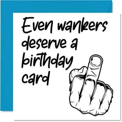 MAKE THEM LAUGH OUT LOUD WITH THIS HILARIOUS HAPPY BIRTHDAY CARD: This exceptional quality birthday card for him or her shows the design "Even Wankers Deserve A Birthday Card". If you are looking for offensive birthday greetings cards for her or him, then this happy birthday card is bound to make them laugh. Not just for birthday gifts for him this could also be a card for Best Friend, Work Colleague, Brother, Sister, Cousin or Uncle. WHAT DO YOU GET: The card is printed on one side and BLANK ON THE INSIDE to allow you to write your very own message. The unique fun design is printed on a specially sourced and environmentally responsible board. At 360 microns thick the natural white one-sided gloss board has a quality look and feel. Supplied with a coloured gummed envelope to complement the design and ready to be sealed and sent in the post. 30th birthday card for him, birthday card for Dad. NO INK SMUDGES: There is nothing worse than writing inside a card to find that the shiny surface makes the ink smudge. This is why we use a high quality one sided coated board. The uncoated side will absorb more of the ink from your pen to make smudging a thing of the past. Happy birthday Colleague cards, birthday card funny, Step Dad birthday cards, best friend birthday card, rude birthday cards for men. SIZES: Greeting Card = 145mm x 145mm, Envelope = 155mm x 155mm, Card Thickness = 360 micron. Great friend birthday cards from bestfriend. birthday cards for Colleague, Colleague cards birthday, special friend birthday cards, friend 21st birthday card, birthday card friend, male birthday card, 18th birthday card, happy birthday Uncle cards, friend 30th birthday cards, brother birthday card. MADE AND QUALITY CHECKED IN THE UK: We print and manufacture all our product right him in the UK so you can be sure of a fast turnaround and a product that is expertly made. Using environmentally responsible premium board our card is conscious of the responsible management of the world's forests - 21st birthday cards for men, mens birthday cards, oldi card.