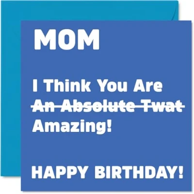 MAKE MOM LAUGH WITH THIS HILARIOUS HAPPY BIRTHDAY CARD MOM: This exceptional quality mothers day card for her shows a funny rude message "An Absolute Twat" being crossed out and replaced with "Amazing!". If you are looking for beautiful birthday greetings cards for her, then this happy mothers day card is bound to make them laugh. Not just for mothers day gifts for Mom this could also be A birthday card for Mom, Mother, Mommy, Mom, Mama, or Mummy. WHAT DO YOU GET: The card is printed on one side and BLANK ON THE INSIDE to allow you to write your very own message. The unique fun design is printed on a specially sourced and environmentally responsible board. At 360 microns thick the natural white one-sided gloss board has a quality look and feel. Supplied with a coloured gummed envelope to complement the design and ready to be sealed and sent in the post. NO INK SMUDGES: There is nothing worse than writing inside a card to find that the shiny surface makes the ink smudge. This is why we use a high quality one sided coated board. The uncoated side will absorb more of the ink from your pen to make smudging a thing of the past. Happy birthday Mom cards, Mam birthday card, Mom birthday cards. SIZES: Greeting Card = 145mm x 145mm, Envelope = 155mm x 155mm, Card Thickness = 360 micron. Great Mom mothers day cards from Daughter or Son. Mom birthday cards from Daughter, birthday cards for Mom, birthday card Mom, Mother birthday card, Mom birthday cards from Son, Mom cards birthday, funny Mom birthday cards, Mom 50th birthday card, birthday card Mom from Daughter. MADE AND QUALITY CHECKED IN THE UK: We print and manufacture all our product right her in the UK so you can be sure of a fast turnaround and a product that is expertly made. Using environmentally responsible premium board our card is conscious of the responsible management of the world's forests - birthday cards Mom, birthday card Mother, Step Mom birthday card, Moms birthday card.