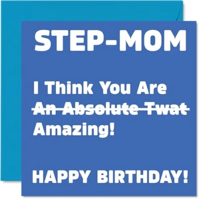 MAKE YOUR STEP-MOM LAUGH WITH THIS HILARIOUS HAPPY BIRTHDAY CARD STEP MOM: This exceptional quality mothers day card for her shows a funny rude message "An Absolute Twat" being crossed out and replaced with "Amazing!". If you are looking for beautiful birthday greetings cards for her, then this happy mothers day card is bound to make them laugh. Not just for mothers day gifts for Step Mom this could also be A birthday card for Step Mom, Mother, Step Mommy, Step Mom, Mama, or Mummy. WHAT DO YOU GET: The card is printed on one side and BLANK ON THE INSIDE to allow you to write your very own message. The unique fun design is printed on a specially sourced and environmentally responsible board. At 360 microns thick the natural white one-sided gloss board has a quality look and feel. Supplied with a coloured gummed envelope to complement the design and ready to be sealed and sent in the post. NO INK SMUDGES: There is nothing worse than writing inside a card to find that the shiny surface makes the ink smudge. This is why we use a high quality one sided coated board. The uncoated side will absorb more of the ink from your pen to make smudging a thing of the past. Happy birthday Step Mom cards, Mam birthday card, Step Mom birthday cards. SIZES: Greeting Card = 145mm x 145mm, Envelope = 155mm x 155mm, Card Thickness = 360 micron. Great Step Mom mothers day cards from Daughter or Son. Step Mom birthday cards from Daughter, birthday cards for Step Mom, birthday card Step Mom, Mother birthday card, Step Mom birthday cards from Son, Step Mom cards birthday, funny Step Mom birthday cards, Step Mom 50th birthday card, birthday card Step Mom from Daughter. MADE AND QUALITY CHECKED IN THE UK: We print and manufacture all our product right her in the UK so you can be sure of a fast turnaround and a product that is expertly made. Using environmentally responsible premium board our card is conscious of the responsible management of the world's forests - birthday cards Step Mom, birthday card Mother, Step Step Mom birthday card, Step Moms birthday card.