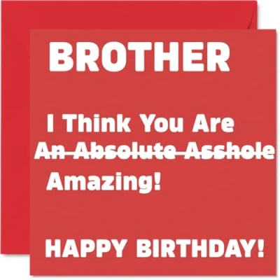 MAKE YOUR BROTHER LAUGH OUT LOUD WITH THIS HILARIOUS BIRTHDAY CARD: This exceptional quality Brother birthday card shows the design 'Brother I Think You Are An Absolute Asshole Amazing! Happy Birthday!'. If you are looking for a funny birthday card Brother, then this happy birthday Brother card is bound to make them giggle. Not just a birthday card for Brother this could also be a birthday gifts for Brother, Step Brother or Silbing. WHAT DO YOU GET: The card is printed on one side and BLANK ON THE INSIDE to allow you to write your very own message. The unique fun design is printed on a specially sourced and environmentally responsible board. At 360 microns thick the natural white one-sided gloss board has a quality look and feel. Supplied with a coloured gummed envelope to complement the design and ready to be sealed and sent in the post. Sister birthday card, Step Brother birthday card. NO INK SMUDGES: There is nothing worse than writing inside a card to find that the shiny surface makes the ink smudge. This is why we use a high quality one sided coated board. The uncoated side will absorb more of the ink from your pen to make smudging a thing of the past. funny Brother birthday cards, rude Brother birthday cards from Sister. SIZES: Greeting Card = 145mm x 145mm, Envelope = 155mm x 155mm, Card Thickness = 360 micron. Happy birthday Brother, Brothers birthday card, Brother cards birthday, birthday card Brother, banter birthday Brother card, Brother gifts from Sister, joke birthday card for Brother. MADE AND QUALITY CHECKED IN THE UK: We print and manufacture all our products right here in the UK so you can be sure of a fast turnaround and a product that is expertly made. Using environmentally responsible premium board our card is conscious of the responsible management of the world's forests - happy birthday card Brother offensive, Brother birthday card hilarious.