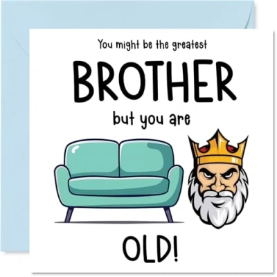 MAKE YOUR BROTHER LAUGH OUT LOUD WITH THIS HILARIOUS BIRTHDAY CARD: This exceptional quality Brother birthday card shows the design 'You Might Be The Greatest Brother But You Are Sofa King Old!'. If you are looking for a funny birthday card Brother, then this happy birthday Brother card is bound to make them giggle. Not just a birthday card for Brother this could also be a birthday gifts for Brother, Step Brother or Silbing. WHAT DO YOU GET: The cards are printed on both sides with the inside print saying 'Happy Birthday To You' and ample space for your own personal message. The funny design is printed on a specially sourced and environmentally responsible board. At 360 microns thick the natural white one-sided gloss board has a quality look and feel. Supplied with a coloured gummed envelope to complement the design and ready to be sealed and sent in the post. NO INK SMUDGES: There is nothing worse than writing inside a card to find that the shiny surface makes the ink smudge. This is why we use a high quality one sided coated board. The uncoated side will absorb more of the ink from your pen to make smudging a thing of the past. funny Brother birthday cards, rude Brother birthday cards from Sister. SIZES: Greeting Card = 145mm x 145mm, Envelope = 155mm x 155mm, Card Thickness = 360 micron. Happy birthday Brother, Brothers birthday card, Brother cards birthday, birthday card Brother, banter birthday Brother card, Brother gifts from Sister, joke birthday card for Brother. MADE AND QUALITY CHECKED IN THE UK: We print and manufacture all our products right here in the UK so you can be sure of a fast turnaround and a product that is expertly made. Using environmentally responsible premium board our card is conscious of the responsible management of the world's forests - happy birthday card Brother offensive, Brother birthday card hilarious.
