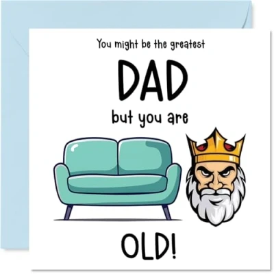 MAKE YOUR DAD LAUGH OUT LOUD WITH THIS HILARIOUS BIRTHDAY CARD: This exceptional quality Dad birthday card shows the design 'You Might Be The Greatest Dad But You Are Sofa King Old!'. If you are looking for a funny birthday card Dad, then this happy birthday Dad card is bound to make them giggle. Not just a birthday card for Dad this could also be a birthday gifts for Dad, Father or Papa. WHAT DO YOU GET: The cards are printed on both sides with the inside print saying 'Happy Birthday To You' and ample space for your own personal message. The funny design is printed on a specially sourced and environmentally responsible board. At 360 microns thick the natural white one-sided gloss board has a quality look and feel. Supplied with a coloured gummed envelope to complement the design and ready to be sealed and sent in the post. NO INK SMUDGES: There is nothing worse than writing inside a card to find that the shiny surface makes the ink smudge. This is why we use a high quality one sided coated board. The uncoated side will absorb more of the ink from your pen to make smudging a thing of the past. funny Dad birthday cards, rude Dad birthday cards from Son. SIZES: Greeting Card = 145mm x 145mm, Envelope = 155mm x 155mm, Card Thickness = 360 micron. Happy birthday Dad, Dads birthday card, Dad cards birthday, birthday card Dad, banter birthday Dad card, Dad gifts from Son, joke birthday card for Dad. MADE AND QUALITY CHECKED IN THE UK: We print and manufacture all our products right here in the UK so you can be sure of a fast turnaround and a product that is expertly made. Using environmentally responsible premium board our card is conscious of the responsible management of the world's forests - happy birthday card Dad offensive, Dad birthday card hilarious.
