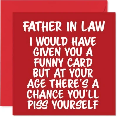 MAKE YOUR FATHER IN LAW LAUGH OUT LOUD WITH THIS HILARIOUS BIRTHDAY CARD: This exceptional quality Father in Law birthday card shows the design 'Father in Law I would have given you a funny card but at your age theres a chance youll piss yourself'. If you are looking for a funny birthday card Father in Law, then this happy birthday Father in Law card is bound to make them giggle. Not just a birthday card for Father in Law this could also be a birthday gifts for Father in Law, Dad or Father. WHAT DO YOU GET: The card is printed on one side and BLANK ON THE INSIDE to allow you to write your very own message. The unique fun design is printed on a specially sourced and environmentally responsible board. At 360 microns thick the natural white one-sided gloss board has a quality look and feel. Supplied with a coloured gummed envelope to complement the design and ready to be sealed and sent in the post. Son birthday card, Dad birthday card. NO INK SMUDGES: There is nothing worse than writing inside a card to find that the shiny surface makes the ink smudge. This is why we use a high quality one sided coated board. The uncoated side will absorb more of the ink from your pen to make smudging a thing of the past. funny Father in Law birthday cards, rude Father in Law birthday cards from Son. SIZES: Greeting Card = 145mm x 145mm, Envelope = 155mm x 155mm, Card Thickness = 360 micron. Happy birthday Father in Law, Father in Laws birthday card, Father in Law cards birthday, birthday card Father in Law, banter birthday Father in Law card, Father in Law gifts from Son, joke birthday card for Father in Law. MADE AND QUALITY CHECKED IN THE UK: We print and manufacture all our products right here in the UK so you can be sure of a fast turnaround and a product that is expertly made. Using environmentally responsible premium board our card is conscious of the responsible management of the world's forests - happy birthday card Father in Law offensive, Father in Law birthday card hilarious.
