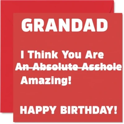 MAKE YOUR GRANDAD LAUGH OUT LOUD WITH THIS HILARIOUS BIRTHDAY CARD: This exceptional quality Grandad birthday card shows the design 'Grandad I Think You Are An Absolute Asshole Amazing! Happy Birthday!'. If you are looking for a funny birthday card Grandad, then this happy birthday Grandad card is bound to make them giggle. Not just a birthday card for Grandad this could also be a birthday gifts for Grandad, Grandpa or Grandfather. WHAT DO YOU GET: The card is printed on one side and BLANK ON THE INSIDE to allow you to write your very own message. The unique fun design is printed on a specially sourced and environmentally responsible board. At 360 microns thick the natural white one-sided gloss board has a quality look and feel. Supplied with a coloured gummed envelope to complement the design and ready to be sealed and sent in the post. Grandson birthday card, Grandpa birthday card. NO INK SMUDGES: There is nothing worse than writing inside a card to find that the shiny surface makes the ink smudge. This is why we use a high quality one sided coated board. The uncoated side will absorb more of the ink from your pen to make smudging a thing of the past. funny Grandad birthday cards, rude Grandad birthday cards from Grandson. SIZES: Greeting Card = 145mm x 145mm, Envelope = 155mm x 155mm, Card Thickness = 360 micron. Happy birthday Grandad, Grandads birthday card, Grandad cards birthday, birthday card Grandad, banter birthday Grandad card, Grandad gifts from Grandson, joke birthday card for Grandad. MADE AND QUALITY CHECKED IN THE UK: We print and manufacture all our products right here in the UK so you can be sure of a fast turnaround and a product that is expertly made. Using environmentally responsible premium board our card is conscious of the responsible management of the world's forests - happy birthday card Grandad offensive, Grandad birthday card hilarious.