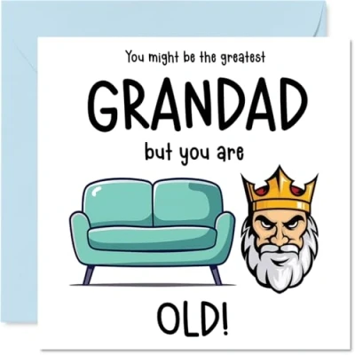 MAKE YOUR GRANDAD LAUGH OUT LOUD WITH THIS HILARIOUS BIRTHDAY CARD: This exceptional quality Grandad birthday card shows the design 'You Might Be The Greatest Grandad But You Are Sofa King Old!'. If you are looking for a funny birthday card Grandad, then this happy birthday Grandad card is bound to make them giggle. Not just a birthday card for Grandad this could also be a birthday gifts for Grandad, Grandpa or Grandfather. WHAT DO YOU GET: The cards are printed on both sides with the inside print saying 'Happy Birthday To You' and ample space for your own personal message. The funny design is printed on a specially sourced and environmentally responsible board. At 360 microns thick the natural white one-sided gloss board has a quality look and feel. Supplied with a coloured gummed envelope to complement the design and ready to be sealed and sent in the post. NO INK SMUDGES: There is nothing worse than writing inside a card to find that the shiny surface makes the ink smudge. This is why we use a high quality one sided coated board. The uncoated side will absorb more of the ink from your pen to make smudging a thing of the past. funny Grandad birthday cards, rude Grandad birthday cards from Grandson. SIZES: Greeting Card = 145mm x 145mm, Envelope = 155mm x 155mm, Card Thickness = 360 micron. Happy birthday Grandad, Grandads birthday card, Grandad cards birthday, birthday card Grandad, banter birthday Grandad card, Grandad gifts from Grandson, joke birthday card for Grandad. MADE AND QUALITY CHECKED IN THE UK: We print and manufacture all our products right here in the UK so you can be sure of a fast turnaround and a product that is expertly made. Using environmentally responsible premium board our card is conscious of the responsible management of the world's forests - happy birthday card Grandad offensive, Grandad birthday card hilarious.