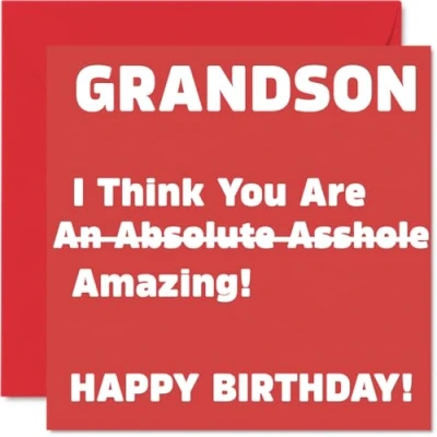 MAKE YOUR GRANDSON LAUGH OUT LOUD WITH THIS HILARIOUS BIRTHDAY CARD: This exceptional quality Grandson birthday card shows the design 'Grandson I Think You Are An Absolute Asshole Amazing! Happy Birthday!'. If you are looking for a funny birthday card Grandson, then this happy birthday Grandson card is bound to make them giggle. Not just a birthday card for Grandson this could also be a birthday gifts for Grandson, Great Grandson or Step Grandson. WHAT DO YOU GET: The card is printed on one side and BLANK ON THE INSIDE to allow you to write your very own message. The unique fun design is printed on a specially sourced and environmentally responsible board. At 360 microns thick the natural white one-sided gloss board has a quality look and feel. Supplied with a coloured gummed envelope to complement the design and ready to be sealed and sent in the post. Grandad birthday card, Great Grandson birthday card. NO INK SMUDGES: There is nothing worse than writing inside a card to find that the shiny surface makes the ink smudge. This is why we use a high quality one sided coated board. The uncoated side will absorb more of the ink from your pen to make smudging a thing of the past. funny Grandson birthday cards, rude Grandson birthday cards from Grandad. SIZES: Greeting Card = 145mm x 145mm, Envelope = 155mm x 155mm, Card Thickness = 360 micron. Happy birthday Grandson, Grandsons birthday card, Grandson cards birthday, birthday card Grandson, banter birthday Grandson card, Grandson gifts from Grandad, joke birthday card for Grandson. MADE AND QUALITY CHECKED IN THE UK: We print and manufacture all our products right here in the UK so you can be sure of a fast turnaround and a product that is expertly made. Using environmentally responsible premium board our card is conscious of the responsible management of the world's forests - happy birthday card Grandson offensive, Grandson birthday card hilarious.