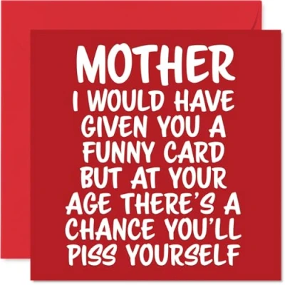 MAKE YOUR MOTHER LAUGH OUT LOUD WITH THIS HILARIOUS BIRTHDAY CARD: This exceptional quality Mother birthday card shows the design 'Mother I would have given you a funny card but at your age theres a chance youll piss yourself'. If you are looking for a funny birthday card Mother, then this happy birthday Mother card is bound to make them giggle. Not just a birthday card for Mother this could also be a birthday gifts for Mother, Mum or Mummy. WHAT DO YOU GET: The card is printed on one side and BLANK ON THE INSIDE to allow you to write your very own message. The unique fun design is printed on a specially sourced and environmentally responsible board. At 360 microns thick the natural white one-sided gloss board has a quality look and feel. Supplied with a coloured gummed envelope to complement the design and ready to be sealed and sent in the post. Son birthday card, Mum birthday card. NO INK SMUDGES: There is nothing worse than writing inside a card to find that the shiny surface makes the ink smudge. This is why we use a high quality one sided coated board. The uncoated side will absorb more of the ink from your pen to make smudging a thing of the past. funny Mother birthday cards, rude Mother birthday cards from Son. SIZES: Greeting Card = 145mm x 145mm, Envelope = 155mm x 155mm, Card Thickness = 360 micron. Happy birthday Mother, Mothers birthday card, Mother cards birthday, birthday card Mother, banter birthday Mother card, Mother gifts from Son, joke birthday card for Mother. MADE AND QUALITY CHECKED IN THE UK: We print and manufacture all our products right here in the UK so you can be sure of a fast turnaround and a product that is expertly made. Using environmentally responsible premium board our card is conscious of the responsible management of the world's forests - happy birthday card Mother offensive, Mother birthday card hilarious.