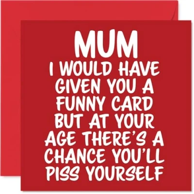 MAKE YOUR MUM LAUGH OUT LOUD WITH THIS HILARIOUS BIRTHDAY CARD: This exceptional quality Mum birthday card shows the design 'Mum I would have given you a funny card but at your age theres a chance youll piss yourself'. If you are looking for a funny birthday card Mum, then this happy birthday Mum card is bound to make them giggle. Not just a birthday card for Mum this could also be a birthday gifts for Mum, Mummy or Mother. WHAT DO YOU GET: The card is printed on one side and BLANK ON THE INSIDE to allow you to write your very own message. The unique fun design is printed on a specially sourced and environmentally responsible board. At 360 microns thick the natural white one-sided gloss board has a quality look and feel. Supplied with a coloured gummed envelope to complement the design and ready to be sealed and sent in the post. Son birthday card, Mummy birthday card. NO INK SMUDGES: There is nothing worse than writing inside a card to find that the shiny surface makes the ink smudge. This is why we use a high quality one sided coated board. The uncoated side will absorb more of the ink from your pen to make smudging a thing of the past. funny Mum birthday cards, rude Mum birthday cards from Son. SIZES: Greeting Card = 145mm x 145mm, Envelope = 155mm x 155mm, Card Thickness = 360 micron. Happy birthday Mum, Mums birthday card, Mum cards birthday, birthday card Mum, banter birthday Mum card, Mum gifts from Son, joke birthday card for Mum. MADE AND QUALITY CHECKED IN THE UK: We print and manufacture all our products right here in the UK so you can be sure of a fast turnaround and a product that is expertly made. Using environmentally responsible premium board our card is conscious of the responsible management of the world's forests - happy birthday card Mum offensive, Mum birthday card hilarious.