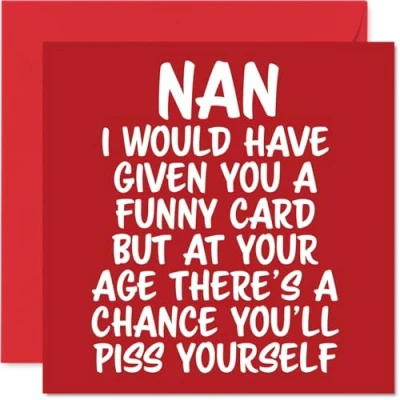 MAKE YOUR NAN LAUGH OUT LOUD WITH THIS HILARIOUS BIRTHDAY CARD: This exceptional quality Nan birthday card shows the design 'Nan I would have given you a funny card but at your age theres a chance youll piss yourself'. If you are looking for a funny birthday card Nan, then this happy birthday Nan card is bound to make them giggle. Not just a birthday card for Nan this could also be a birthday gifts for Nan, Nanny or Grandmother. WHAT DO YOU GET: The card is printed on one side and BLANK ON THE INSIDE to allow you to write your very own message. The unique fun design is printed on a specially sourced and environmentally responsible board. At 360 microns thick the natural white one-sided gloss board has a quality look and feel. Supplied with a coloured gummed envelope to complement the design and ready to be sealed and sent in the post. Grandson birthday card, Nanny birthday card. NO INK SMUDGES: There is nothing worse than writing inside a card to find that the shiny surface makes the ink smudge. This is why we use a high quality one sided coated board. The uncoated side will absorb more of the ink from your pen to make smudging a thing of the past. funny Nan birthday cards, rude Nan birthday cards from Grandson. SIZES: Greeting Card = 145mm x 145mm, Envelope = 155mm x 155mm, Card Thickness = 360 micron. Happy birthday Nan, Nans birthday card, Nan cards birthday, birthday card Nan, banter birthday Nan card, Nan gifts from Grandson, joke birthday card for Nan. MADE AND QUALITY CHECKED IN THE UK: We print and manufacture all our products right here in the UK so you can be sure of a fast turnaround and a product that is expertly made. Using environmentally responsible premium board our card is conscious of the responsible management of the world's forests - happy birthday card Nan offensive, Nan birthday card hilarious.