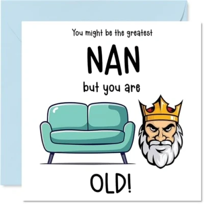 MAKE YOUR NAN LAUGH OUT LOUD WITH THIS HILARIOUS BIRTHDAY CARD: This exceptional quality Nan birthday card shows the design 'You Might Be The Greatest Nan But You Are Sofa King Old!'. If you are looking for a funny birthday card Nan, then this happy birthday Nan card is bound to make them giggle. Not just a birthday card for Nan this could also be a birthday gifts for Nan, Nanny or Grandmother. WHAT DO YOU GET: The cards are printed on both sides with the inside print saying 'Happy Birthday To You' and ample space for your own personal message. The funny design is printed on a specially sourced and environmentally responsible board. At 360 microns thick the natural white one-sided gloss board has a quality look and feel. Supplied with a coloured gummed envelope to complement the design and ready to be sealed and sent in the post. NO INK SMUDGES: There is nothing worse than writing inside a card to find that the shiny surface makes the ink smudge. This is why we use a high quality one sided coated board. The uncoated side will absorb more of the ink from your pen to make smudging a thing of the past. funny Nan birthday cards, rude Nan birthday cards from Grandson. SIZES: Greeting Card = 145mm x 145mm, Envelope = 155mm x 155mm, Card Thickness = 360 micron. Happy birthday Nan, Nans birthday card, Nan cards birthday, birthday card Nan, banter birthday Nan card, Nan gifts from Grandson, joke birthday card for Nan. MADE AND QUALITY CHECKED IN THE UK: We print and manufacture all our products right here in the UK so you can be sure of a fast turnaround and a product that is expertly made. Using environmentally responsible premium board our card is conscious of the responsible management of the world's forests - happy birthday card Nan offensive, Nan birthday card hilarious.