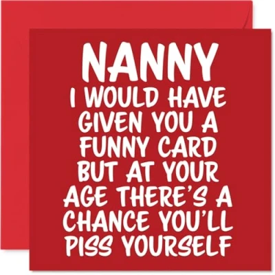 MAKE YOUR NANNY LAUGH OUT LOUD WITH THIS HILARIOUS BIRTHDAY CARD: This exceptional quality Nanny birthday card shows the design 'Nanny I would have given you a funny card but at your age theres a chance youll piss yourself'. If you are looking for a funny birthday card Nanny, then this happy birthday Nanny card is bound to make them giggle. Not just a birthday card for Nanny this could also be a birthday gifts for Nanny, Nan or Grandmother. WHAT DO YOU GET: The card is printed on one side and BLANK ON THE INSIDE to allow you to write your very own message. The unique fun design is printed on a specially sourced and environmentally responsible board. At 360 microns thick the natural white one-sided gloss board has a quality look and feel. Supplied with a coloured gummed envelope to complement the design and ready to be sealed and sent in the post. Grandson birthday card, Nan birthday card. NO INK SMUDGES: There is nothing worse than writing inside a card to find that the shiny surface makes the ink smudge. This is why we use a high quality one sided coated board. The uncoated side will absorb more of the ink from your pen to make smudging a thing of the past. funny Nanny birthday cards, rude Nanny birthday cards from Grandson. SIZES: Greeting Card = 145mm x 145mm, Envelope = 155mm x 155mm, Card Thickness = 360 micron. Happy birthday Nanny, Nannys birthday card, Nanny cards birthday, birthday card Nanny, banter birthday Nanny card, Nanny gifts from Grandson, joke birthday card for Nanny. MADE AND QUALITY CHECKED IN THE UK: We print and manufacture all our products right here in the UK so you can be sure of a fast turnaround and a product that is expertly made. Using environmentally responsible premium board our card is conscious of the responsible management of the world's forests - happy birthday card Nanny offensive, Nanny birthday card hilarious.