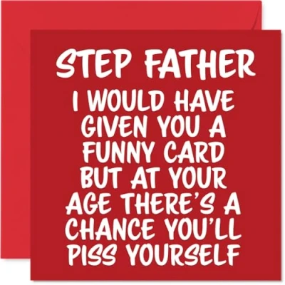 MAKE YOUR STEP FATHER LAUGH OUT LOUD WITH THIS HILARIOUS BIRTHDAY CARD: This exceptional quality Step Father birthday card shows the design 'Step Father I would have given you a funny card but at your age theres a chance youll piss yourself'. If you are looking for a funny birthday card Step Father, then this happy birthday Step Father card is bound to make them giggle. Not just a birthday card for Step Father this could also be a birthday gifts for Step Father, Step Dad or Dad. WHAT DO YOU GET: The card is printed on one side and BLANK ON THE INSIDE to allow you to write your very own message. The unique fun design is printed on a specially sourced and environmentally responsible board. At 360 microns thick the natural white one-sided gloss board has a quality look and feel. Supplied with a coloured gummed envelope to complement the design and ready to be sealed and sent in the post. Son birthday card, Step Dad birthday card. NO INK SMUDGES: There is nothing worse than writing inside a card to find that the shiny surface makes the ink smudge. This is why we use a high quality one sided coated board. The uncoated side will absorb more of the ink from your pen to make smudging a thing of the past. funny Step Father birthday cards, rude Step Father birthday cards from Son. SIZES: Greeting Card = 145mm x 145mm, Envelope = 155mm x 155mm, Card Thickness = 360 micron. Happy birthday Step Father, Step Fathers birthday card, Step Father cards birthday, birthday card Step Father, banter birthday Step Father card, Step Father gifts from Son, joke birthday card for Step Father. MADE AND QUALITY CHECKED IN THE UK: We print and manufacture all our products right here in the UK so you can be sure of a fast turnaround and a product that is expertly made. Using environmentally responsible premium board our card is conscious of the responsible management of the world's forests - happy birthday card Step Father offensive, Step Father birthday card hilarious.