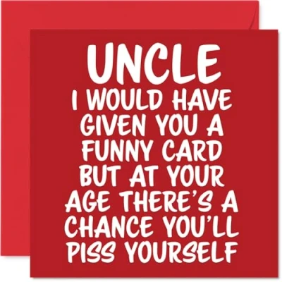MAKE YOUR UNCLE LAUGH OUT LOUD WITH THIS HILARIOUS BIRTHDAY CARD: This exceptional quality Uncle birthday card shows the design 'Uncle I would have given you a funny card but at your age theres a chance youll piss yourself'. If you are looking for a funny birthday card Uncle, then this happy birthday Uncle card is bound to make them giggle. Not just a birthday card for Uncle this could also be a birthday gifts for Uncle, Step Uncle or Uncle in Law. WHAT DO YOU GET: The card is printed on one side and BLANK ON THE INSIDE to allow you to write your very own message. The unique fun design is printed on a specially sourced and environmentally responsible board. At 360 microns thick the natural white one-sided gloss board has a quality look and feel. Supplied with a coloured gummed envelope to complement the design and ready to be sealed and sent in the post. Nephew birthday card, Step Uncle birthday card. NO INK SMUDGES: There is nothing worse than writing inside a card to find that the shiny surface makes the ink smudge. This is why we use a high quality one sided coated board. The uncoated side will absorb more of the ink from your pen to make smudging a thing of the past. funny Uncle birthday cards, rude Uncle birthday cards from Nephew. SIZES: Greeting Card = 145mm x 145mm, Envelope = 155mm x 155mm, Card Thickness = 360 micron. Happy birthday Uncle, Uncles birthday card, Uncle cards birthday, birthday card Uncle, banter birthday Uncle card, Uncle gifts from Nephew, joke birthday card for Uncle. MADE AND QUALITY CHECKED IN THE UK: We print and manufacture all our products right here in the UK so you can be sure of a fast turnaround and a product that is expertly made. Using environmentally responsible premium board our card is conscious of the responsible management of the world's forests - happy birthday card Uncle offensive, Uncle birthday card hilarious.