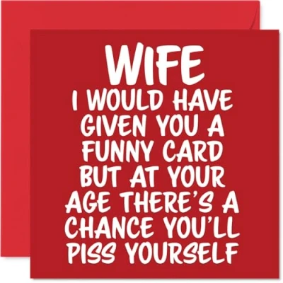 MAKE YOUR WIFE LAUGH OUT LOUD WITH THIS HILARIOUS BIRTHDAY CARD: This exceptional quality Wife birthday card shows the design 'Wife I would have given you a funny card but at your age theres a chance youll piss yourself'. If you are looking for a funny birthday card Wife, then this happy birthday Wife card is bound to make them giggle. Not just a birthday card for Wife this could also be a birthday gifts for Wife, Wifey or Partner. WHAT DO YOU GET: The card is printed on one side and BLANK ON THE INSIDE to allow you to write your very own message. The unique fun design is printed on a specially sourced and environmentally responsible board. At 360 microns thick the natural white one-sided gloss board has a quality look and feel. Supplied with a coloured gummed envelope to complement the design and ready to be sealed and sent in the post. Husband birthday card, Wifey birthday card. NO INK SMUDGES: There is nothing worse than writing inside a card to find that the shiny surface makes the ink smudge. This is why we use a high quality one sided coated board. The uncoated side will absorb more of the ink from your pen to make smudging a thing of the past. funny Wife birthday cards, rude Wife birthday cards from Husband. SIZES: Greeting Card = 145mm x 145mm, Envelope = 155mm x 155mm, Card Thickness = 360 micron. Happy birthday Wife, Wifes birthday card, Wife cards birthday, birthday card Wife, banter birthday Wife card, Wife gifts from Husband, joke birthday card for Wife. MADE AND QUALITY CHECKED IN THE UK: We print and manufacture all our products right here in the UK so you can be sure of a fast turnaround and a product that is expertly made. Using environmentally responsible premium board our card is conscious of the responsible management of the world's forests - happy birthday card Wife offensive, Wife birthday card hilarious.