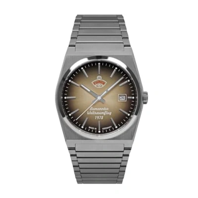Made in Germany - Matte stainless steel case with polished bezel - Stainless steel base with glass insert to see the movement - Case diameter approx. 40 mm Case height: approx. 12 mm, white hour, minute and second display, brown dial with silver indexes Dial with "Bemannter Space Vol 1978" lettering, luminous material on hands and hour markers, date at 03:00, flat sapphire crystal, knurled stainless steel crown Japanese Miyota 8315 Automatic Movement, 21 Stones, Waterproof 10 ATM (test pressure according to DIN8310), Silver Stainless Steel Link Bracelet with Safety Folding Clasp Weight: approx. 125 g, lug width: 22 mm, wrist circumference: maximum approx. 20.5 cm