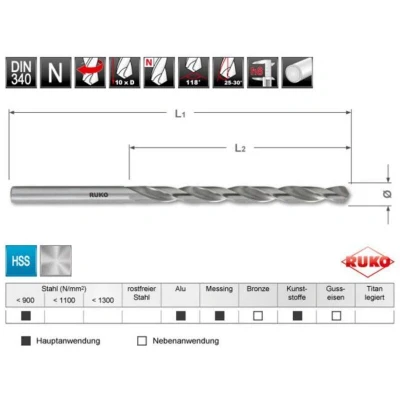 RUKO 203040 Pack de 10 brocas helicoidales Larga DIN 340, tipo N HSS, fresada rectificada (Ø 4 mm)