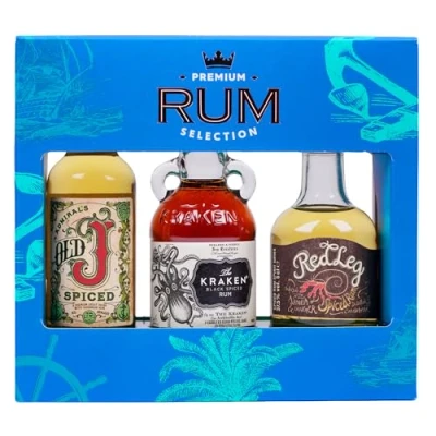 5cl The Kraken Black Spiced (40% ABV) - An imported rum from the Caribbean blended with secret spices named for the sea beast of myth and legend, The Kraken is bold, rich, black and smooth. Aroma - Caramel, toffee, spice Flavour - Cinnamon, vanilla, nutmeg Finish - A spicy and lingering finish. 5cl Admiral’s Old J Spiced Rum (35% ABV) - In 1740 Admiral Edward Vernon enforced a reduction in the strength of the British navy's rum ration. When his men complained, Vernon suggested the addition of limes and sugar to make the drink more enjoyable Old J has been created in honour of this unlikely mixologist. Old J brings Vernon's concept into the 21st century by infusing a special blend of 11 flavours into the finest Caribbean rum. 5cl Red Leg Spiced Rum (37.5% ABV) - The secret to the great taste of Red Leg is all in the blending, the rum is left to rest in oak barrels and infused with Jamaican ginger and vanilla spices. An instantly sweet smell is followed by a warming ginger aroma, this satisfying combination of sweet and spice creates a rum with an incredibly smooth taste, and a warming mouth feel.