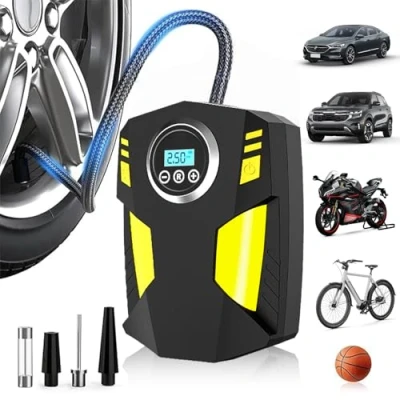 【Preset Tyre Pressure & Auto Shut-Off】The tyre inflator air compressor provides you with a safe usage experience thanks to its auto shut-off function.You just need to start the engine, plug the cigarette lighter into the car's 12V power outlet, link the tyres, press the‘Switch button’to select the mode, and then press the‘+’and ‘-’buttons to preset the required pressure. When the Portable tyre inflator reaches the required pressure,the car air compressor will automatically switch off, so you don't have to worry about over-inflation. 【Led-Lighting & Digital Screen, Real-Time Pressure】Tyre inflator comes with the LED lights and accurate pressure gauge, giving you an accurate and intuitive reading experience, the digital display readout avoids the reading error of the traditional dial tyre pumps, help you be ready for nighttime emergencies. 【Quick Inflation】air compressor tyre inflator for different pumping modes that can be easily attached to any tyre, Simple as plugging into your car's 12v socket, attach the stem to the tyre valve. A simple push and our car tyre inflator has enough power to inflate a standard car tyre in 3-5 minutes.( with 2 nozzles, 1 needle valve adapter, 1 a fuse, and a user manual.) 【Wide Compatibility】This tyre inflator air compressor is universally compatible with cars, bicycles, motorbikes, air mattresses, inflatable boats, balls, basketballs, swimming rings, and more. (1. Please check the user manual before use and follow the steps in the manual. If you have any questions, please feel free to contact customer service. 2. Replacement fuse is included in the package. If there is a problem when the product is not in use, you can check if the fuse is blown and replace it before use.) 【Power Cable And LED Lights】:The car tyre pump comes with a 0.35metre hose and a 3 metre power cable that can be easily attached to any tyre. The top is also equipped with LED light to illuminate you in dark environments for easy inflation and as an emergency light in case of emergency.