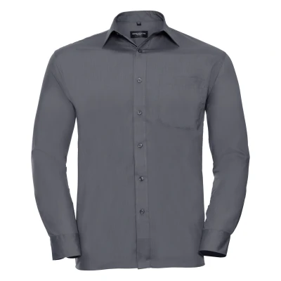 One of the great classic shirt fabrics, combining elegance with durability and wearer comfort. A fine poplin fabric in a classic shirt design. Classic style boned collar. Back yoke with 2 side pleats. Rounded 2 button adjustable cuff plus single button on cuff gauntlet. Mitre shaped pocket over left chest. Straight bottom hem. The elegant lightweight fabric is especially suited for finer embroidery. Also available in ladies sizes, code 934F. Weight: 100-110g/m². Fabric: 35% Cotton Poplin, 65% Polyester. 14.5. (36-38: Chest (ins)). 15.5 (38-40: Chest (ins)). 16. (40-42: Chest (ins)). 17. (42-44: Chest (ins)). 18 (44-46: Chest (ins)). 18.5. (46-48: Chest (ins)). 19.5. (48-50: Chest (ins)). RUSSELL COLLECTION - a variety of Mens and Womens corporatewear in a wide range of styles, colours and sizes.