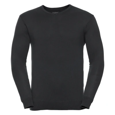 The classic, contemporary styled easy care V-neck pullover - for stylish layering over shirt or polo. Easy care CottonBlend that combines the coolness and lightness of Cotton with the softness, warmth and stain resistance of acrylic. Elastane on cuffs and waistband trim to retain shape and smart appearance. Contemporary styling. Fully fashioned knitted V-neck pullover with set-in-sleeve. Quick to dry. Extensive range. Washable at 40°c and tumble dryable. Fine gauge knit provides an excellent surface for embroidery and badging. Also available in ladies sizes, code 710F. Weight: 275g/m². Fabric: CottonBlend 50% Cotton 50% Acrylic. Sizes: Size XS Chest To Fit (ins) 34-36. S Chest To Fit (ins) 36-38. M Chest To Fit (ins) 38-40. L Chest To Fit (ins) 40-42. XL Chest To Fit (ins) 42-44. 2XL Chest To Fit (ins) 44-46. 3XL Chest To Fit (ins) 46-48. 4XL Chest To Fit (ins) 48-50. RUSSELL COLLECTION - a variety of Mens and Womens corporatewear in a wide range of styles, colours and sizes.
