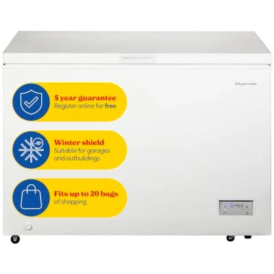 CurrysGood to know - This Russell Hobbs freezer's whopping 308 litres of space can store up to 20 grocery bags worth of food - With the adjustable thermostat, you call the shots - whether you're storing ice cream or fish - The counter balance lid will save you the hassle of holding up the lid while rummaging for food - Keep your frozen snacks organised with its 2 baskets- Make room in your house by sticking it in your garage or outbuilding- There's a front drain hole for fuss-free defrosting