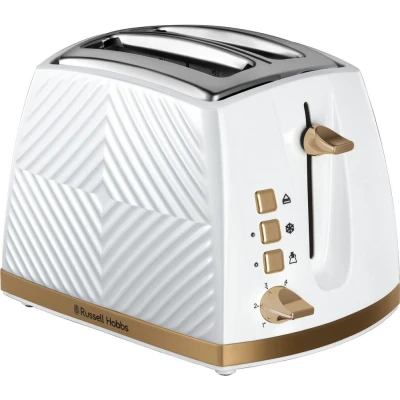 Russell Hobbs Groove 2 Slice Toaster (High Lift, Extra Wide Slots, 6 Browning levels, Frozen/Cancel/Reheat function Illuminated buttons, Removable crumb tray, 850W, White, Brushed gold accents)26391