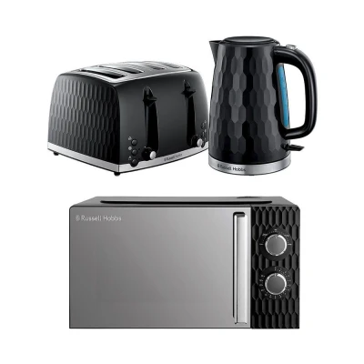 Breakfast prep is quick and easy with this Russell Hobbs Honeycomb kitchen bundle. Start your day by brewing a morning cuppa in the 1.7 litre jug kettle. While that's going, pop some bread in the 4-slice toaster and pick your perfect shade with its dual variable browning levels - whether you're into a light crisp or a rich golden finish. And when it's time for lunch, the 700 W microwave has you covered. Warm up last night's leftovers or defrost chicken fast so dinner's ready when you are.Good to know- The microwave has a 245 mm turntable so you can easily fit in a dinner plate- Put on the 30-minute timer and relax as your dinner warms up in the microwave- Cook, warm, and thaw with absolute precision using the microwave's five power levels- Running late for work? Get your cuppa ready in just 43 seconds with its rapid boil technology- Boil dry protection means your kettle won't boil if there isn't enough water- Pour like a pro without messy spills with its perfect spout design- It's high lift feature means you can pick up your toast without burning your fingertips- The removable crumb tray can be emptied straight into the bin to keep your countertops nice and tidy