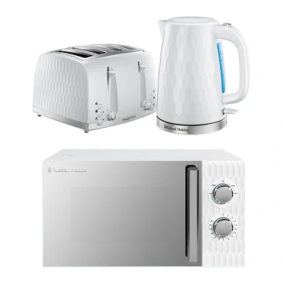 CurrysBreakfast prep is quick and easy with this Russell Hobbs Honeycomb kitchen bundle. Start your day by brewing a morning cuppa in the 1.7 litre jug kettle. While that's going, pop some bread in the 4-slice toaster and pick your perfect shade with its dual variable browning levels - whether you're into a light crisp or a rich golden finish. And when it's time for lunch, the 700 W microwave has you covered. Warm up last night's leftovers or defrost chicken fast so dinner's ready when you are.Good to know- The microwave has a 245 mm turntable so you can easily fit in a dinner plate- Put on the 30-minute timer and relax as your dinner warms up in the microwave- Cook, warm, and thaw with absolute precision using the microwave's five power levels- Running late for work? Get your cuppa ready in just 43 seconds with its rapid boil technology- Boil dry protection means your kettle won't boil if there isn't enough water- Pour like a pro without messy spills with its perfect spout design- It's high lift feature means you can pick up your toast without burning your fingertips- The removable crumb tray can be emptied straight into the bin to keep your countertops nice and tidy