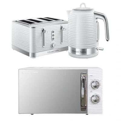 Russell Hobbs Inspire White Kitchen Set, 1.7L 2400W Kettle, 4 Slice Toaster with Variable Browning Levels & 17L 700W Microwave 5 Power Levels, Defrost Reheat Functions INSPBNDL4W