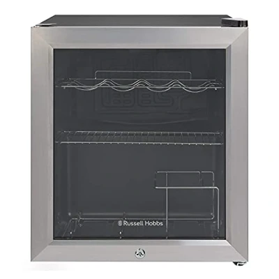 Russell Hobbs Mini Fridge 12 Bottle/46L Lockable Freestanding Stainless Steel Table Top Beer & Wine Fridge, LED Light Lock and Key with Glass Door RHGWC3SS LCK