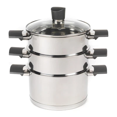 Russell Hobbs RH01170EU Excellence 3 Tier Steamer 18 cm Cooking Pots with Tempered Glass Lid, Non Stick Coating, Stainless Steel, Vegetable Steaming Pan, Induction Suitable, Soft Touch Handles