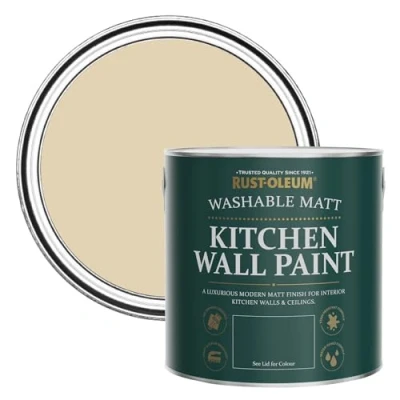 Cook up a storm with Rust-Oleum Kitchen Wall Paint. This long-lasting, stain-resistant kitchen paint is perfect for transforming your walls and ceilings with an incredible depth of colour in a contemporary, smooth matt finish Rust-Oleum Kitchen Wall Paint resists cracking, peeling & blistering for up to 6 years before first maintenance when applied according to label instructions. No need to worry about splashes and spills, as this washable paint has increased durability against everyday stains - with a top Scrub Rating* for easy cleaning Water-based paint and virtually odourless, apply to new or previously painted plaster, brick or concrete walls and ceilings. Scrubbable Kitchen paint for easy cleaning (Tested to ISO 11998 Class 1 Wet Scrub Rated) Coverage: 12m2 per litre. For best results apply two coats, available in 150 colours to match any Kitchen colour scheme and comes in a 2.5L tin, Manufacturer: Rust-Oleum