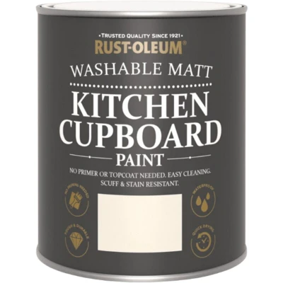Rust-Oleum Kitchen Cupboard Paint Spice up your kitchen with Rust-Oleum Kitchen Cupboard Paint. The ultra-durable, scrubbable formula is perfect for refreshing wood, gloss and melamine cupboard doors with an incredible depth of colour. Available in matt, satin and gloss finishes and over 100 stunning shades, the finish is hard-wearing enough to handle regular wipe-downs and stand up to the splashes and spills of a busy kitchen. With no primer or topcoat needed, your next DIY project will be a recipe for success. • Ultra-durable, scrubbable and water-resistant • Available in matt, satin and gloss finishes. Choose from 100+ colours • Suitable for wood, gloss and melamine surfaces • Not for use on counter tops or direct onto metal • Can be applied over old paint and varnish • Highly concentrated with exceptional coverage • No priming or sanding necessary • Interior use only