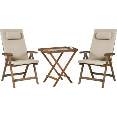 Rustic Garden Bistro Balcony Set Natural Solid Acacia Table 2 Chairs Folding with Taupe Cushions Amantea Premium