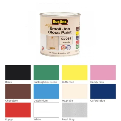 General description Rustins Quick Dry Small Job Paint is specifically designed for small painting projects. This water-based, hardwearing paint is suitable for both interior and exterior use, providing a quick drying time of approximately 30 minutes. It is available in a variety of colors, including Post Office Red, and is ideal for use on wood and metal surfaces. Technical specifications Volume: 250ml Coverage: Approximately 3.25 sq.m. Finish: Gloss Other information Conforms to the Toys (Safety) Regulations 1995, BS:EN71 Part 3, making it safe for use on children's toys and furniture. Available colors include Buckingham Green, Black, Buttercup, Chocolate, Delphinium, Magnolia, Oxford Blue, Candy Pink, Poppy, White, and Pearl Grey. For Satin finish, available colors include Buckingham Green, Black, Buttercup, Chocolate, Oxford Blue, Poppy, and White. Small Job Primer & Undercoat available in Grey & White 250ml.