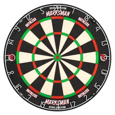 Ruthless Marksman high quality professional level dart board. Manufactured using ultra thin wires to maximise the scoring areas. Made using high quality sisal for a durable long lasting board. The board is designed to be used with all steel tip darts. Dartboard Specification | Material: Sisal | Diameter: 450mm | Depth: 38mm