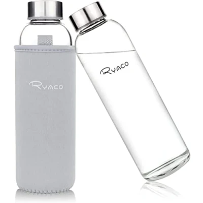 RYACO Borosilicate Glass Water Bottle 550ml BPA Free Leak Proof Ideal for School Home Office Travel Sport Yoga Gym Hot Cold Drinks with Portable Neoprene Carrying Sleeve and Sponge Brush